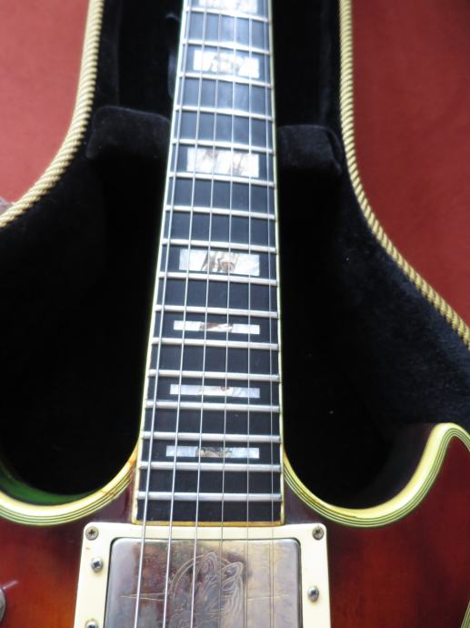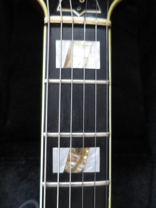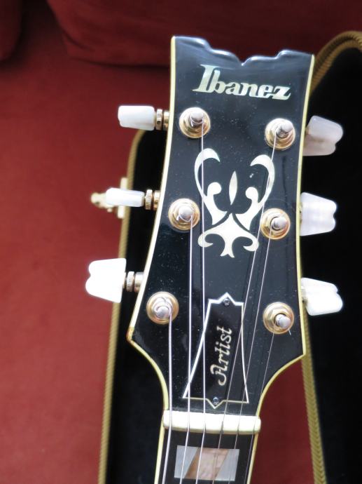 Neck: 22 frets. Slender profile maple neck with nicely aged 3-ply binding &black side-dots. Ebony fingerboard with beautiful mother of pearl &abalone block inlays. Frets show some light wear, but have plenty of life in them. 3-ply bound headstock with mother of pearl inlay. Ibanez Pat Pend tuners with pearloid buttons in perfect working condition. 1 11/16" brass/bone nut; 25" scale length. Neck is straight &truss rod is in good working condition.