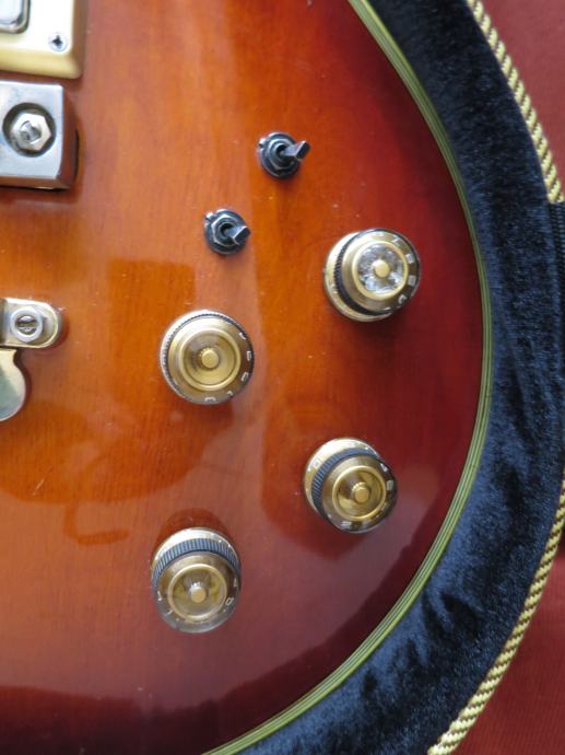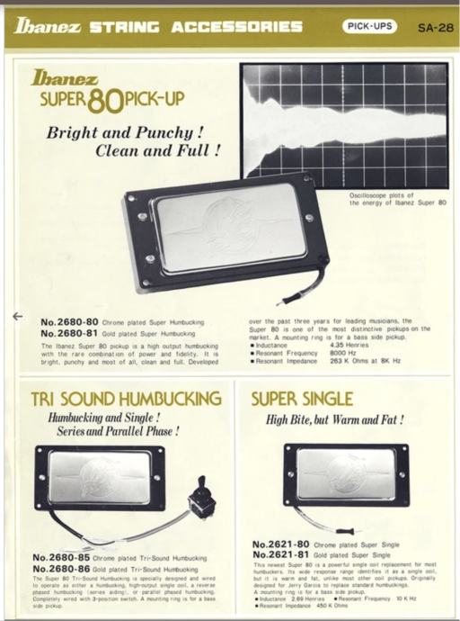 Pickups: Ibanez Super 80 humbuckers with cream bezels &"Flying Finger" covers. Bridge - 7.56K ohms; Neck - 7.66K ohms. Dual volume &tone controls with gold speed knobs with rubber grips. 3-way pickup toggle switch; 2 Tri-Sound mini switches.