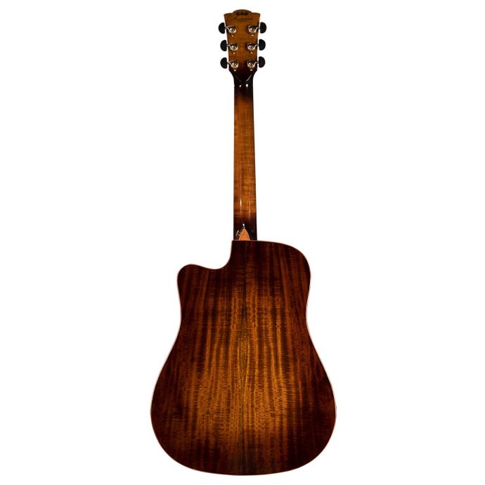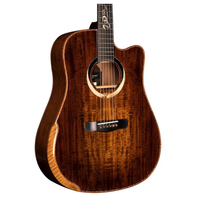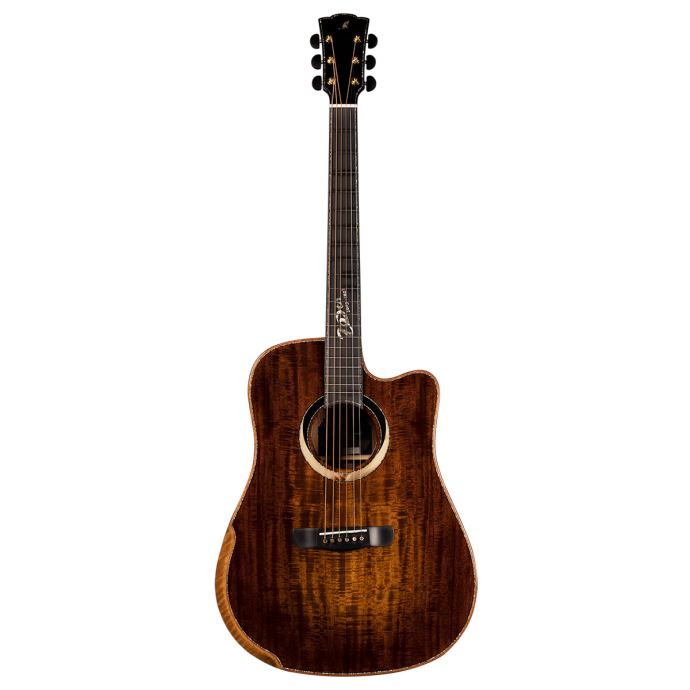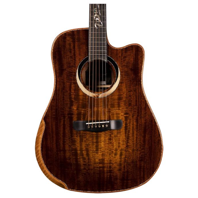 Akustična gitara dreadnought oblika s punom prednjom pločom od masivne smreke s furnirom od plamene koe i tijelom od plamene koe.