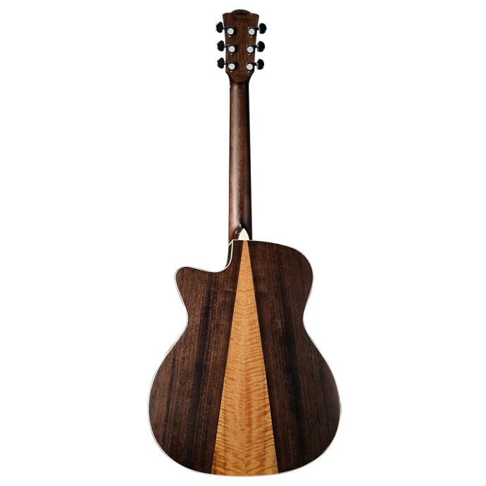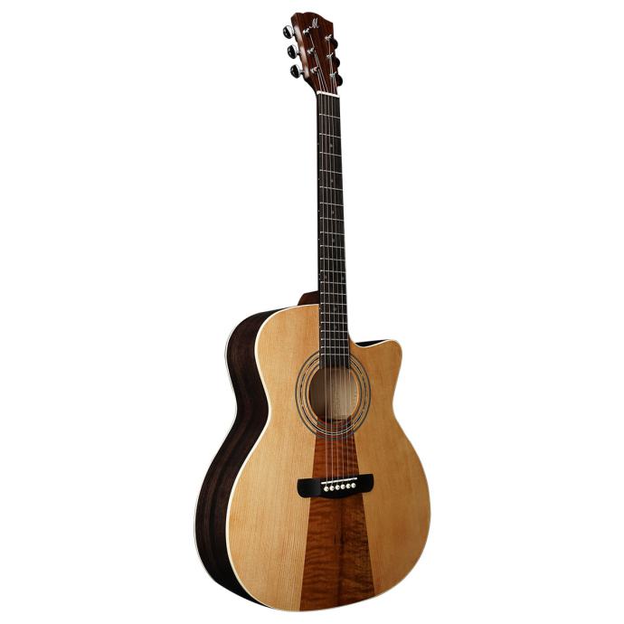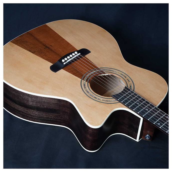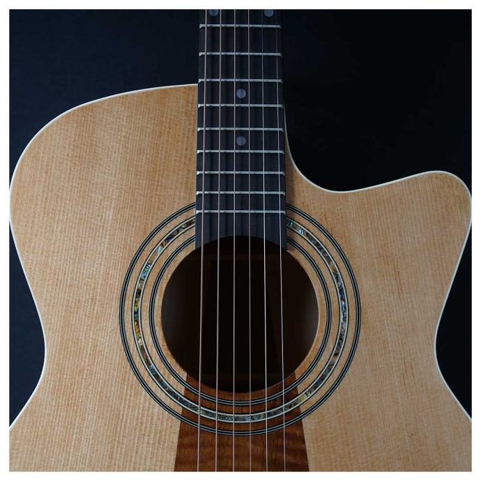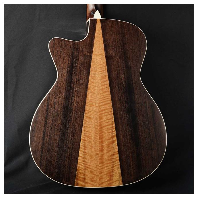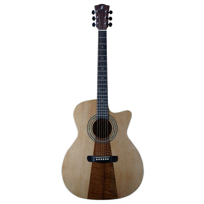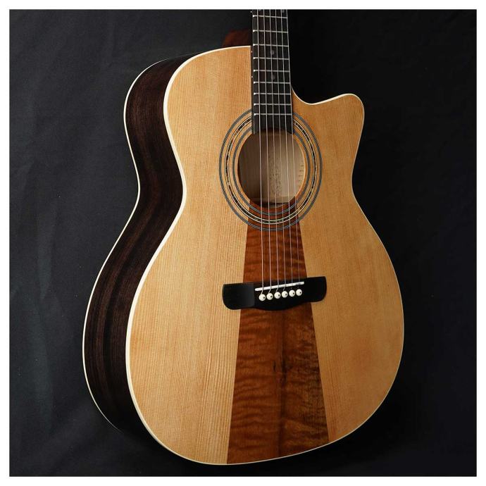 Elektro-akustična gitara grand auditorium oblika s punom prednjom pločom od masivne smreke s umetcima od plamenog mahagonija, tijelom od masivne topole s umetcima od oplamenog mahagonija i Mings elektronikom.