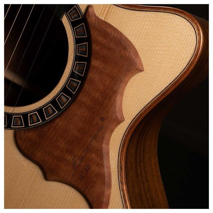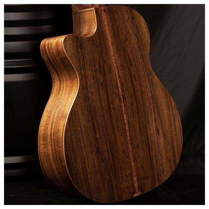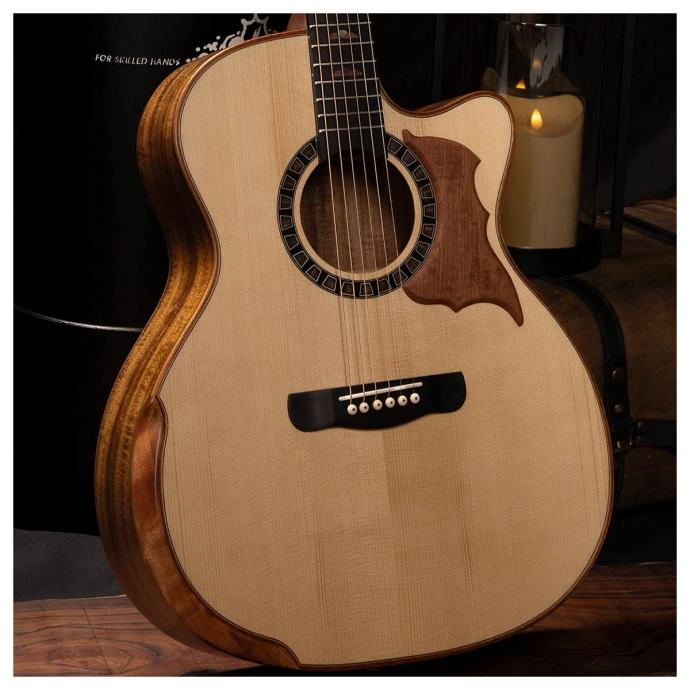 Elektro-akustična gitara grand auditorium oblika s punom prednjom pločom od masivne smreke, tijelom od plamene koe i Mings elektronikom.