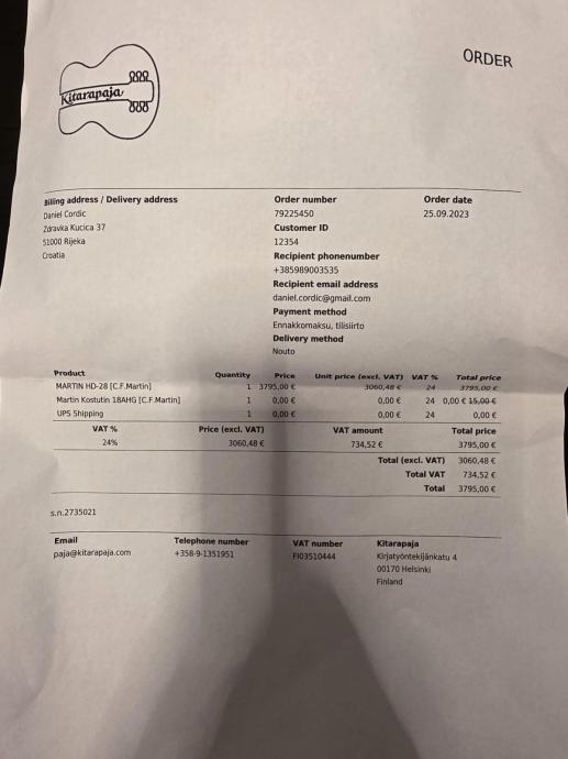 Prodajem vrhunsku akustičnu gitaru Martin HD-28, kupljenu u 09/2023 u trgovini Kitarapaja (Finska).