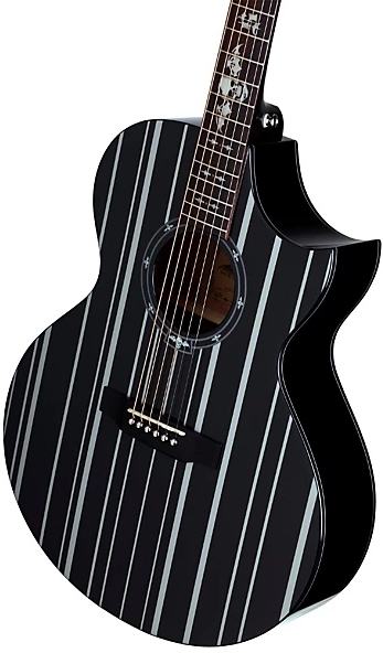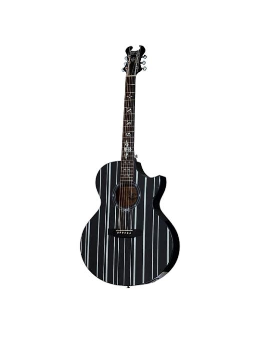 Ova akustična gitara potpisana od strane Synyster Gatesa iz Avenged Sevenfolda kombinira vizualnu agresivnost s vrhunskom svirljivošću. Tijelo je izrađeno od mahagonija s gornjom pločom od smreke, dok vrat koristi DoveTail set-neck konstrukciju od mahagonija s tankim “C” profilom za udobno sviranje. Prstohvat od palisandera s 20 medium pragova i radijusom od 16” koji pruža ravnotežu između solo i ritam gitare. Ugrađeno Schecter CE304T pretpojačalo s 3-pojasnim EQ-om i tunerom omogućuje preciznu kontrolu zvuka. Gitara je opremljena Schecter piezo pickupom i kromiranim hardverom, a dolazi u upečatljivoj Gloss Black izvedbi sa srebrnim pinstripe detaljima.