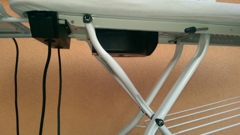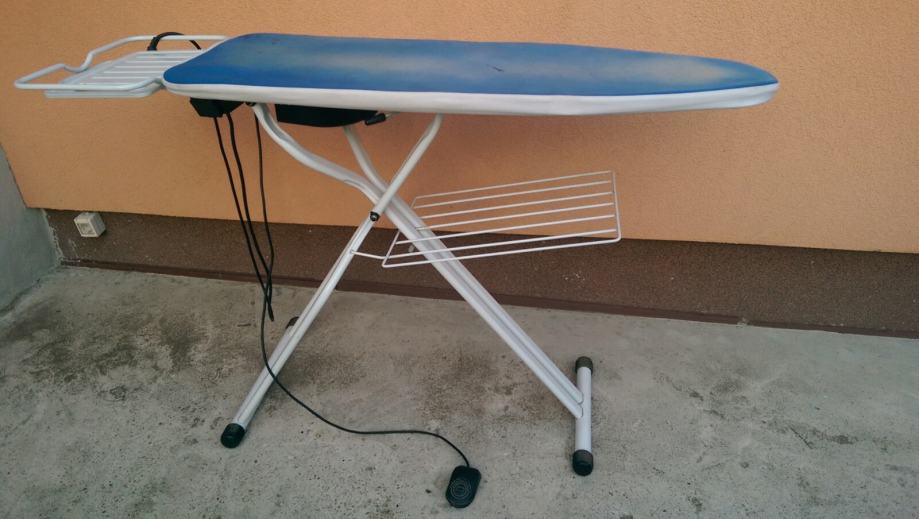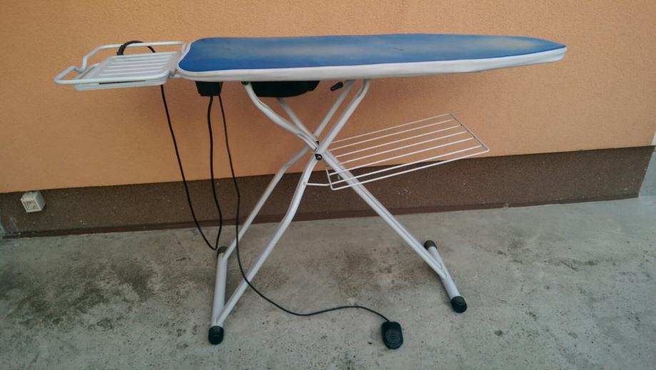 Ukljucuje se u struju, ima mogucnost pustanja zraka tako da se tkanina "zalijepi" za dasku, a ujedno i rashladjuje okolinu peglanja ("klima"). D