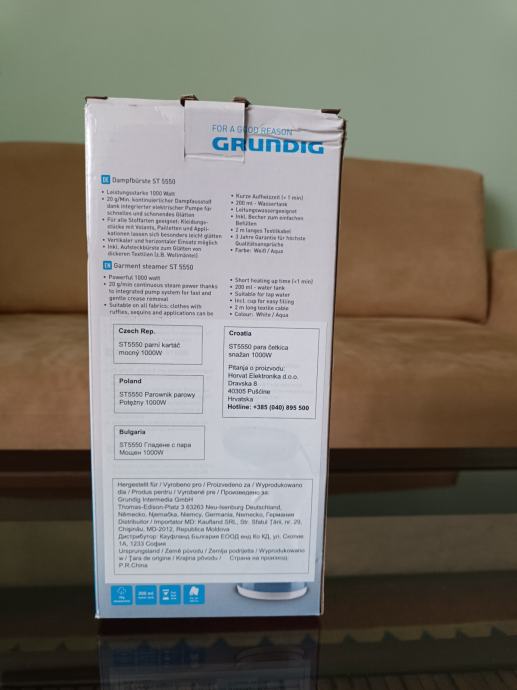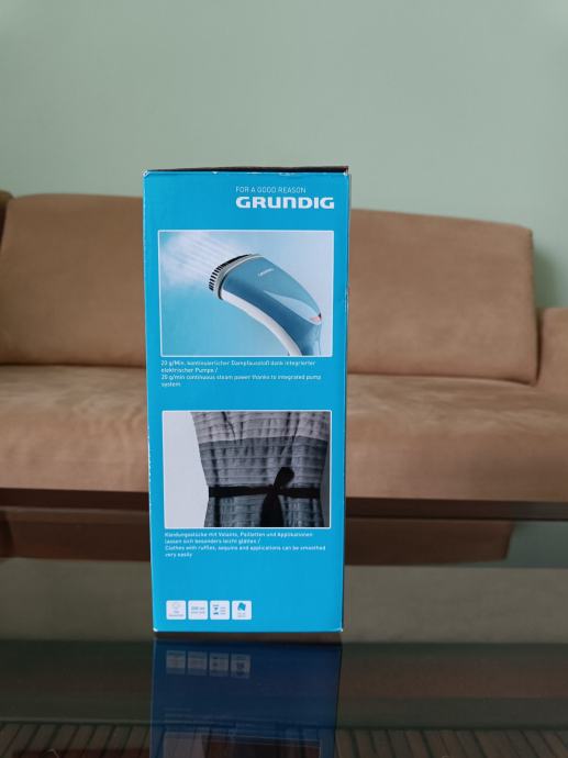 Prodajem nekorišteno, okomito Grundig glačalo. Brzo se zagrijava, spremnik za vodu od 200ml, prikladan za korištenje vode iz pipe, kabel dug 2m, prikladan za sve vrste tkanina. Omogućava 20 min neprekinute jačine pare. Ne šaljem poštom.