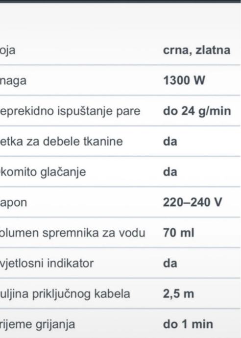 Mozete se po nazivu modela informirati o karakteristikama, no izdvojiti cu kao prednost dugacak kabel, veliku povrsinu grijace ploce, veliku snagu i jacinu ispustanja pare.