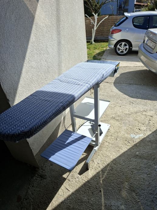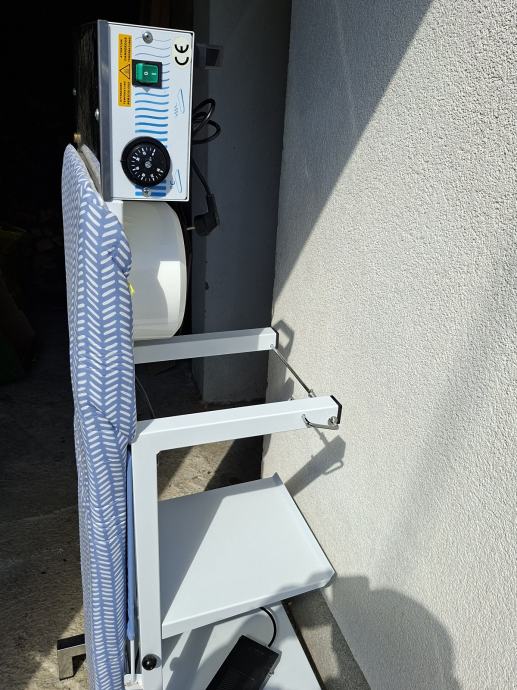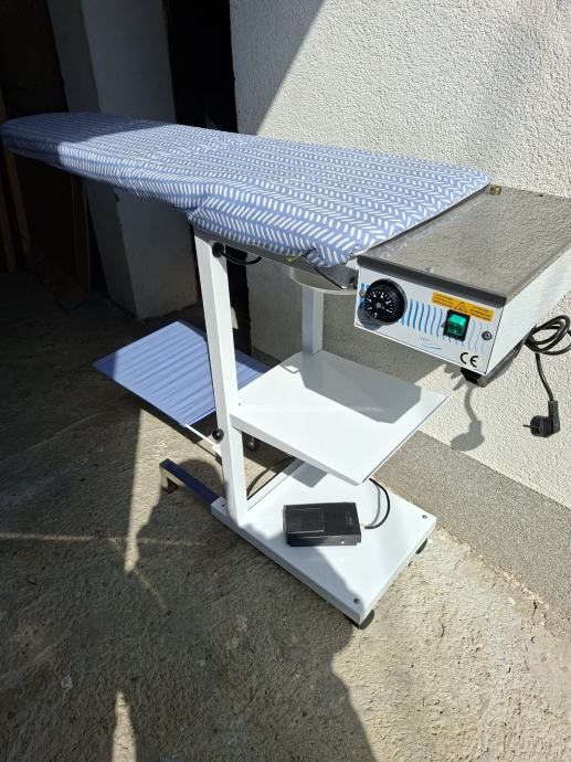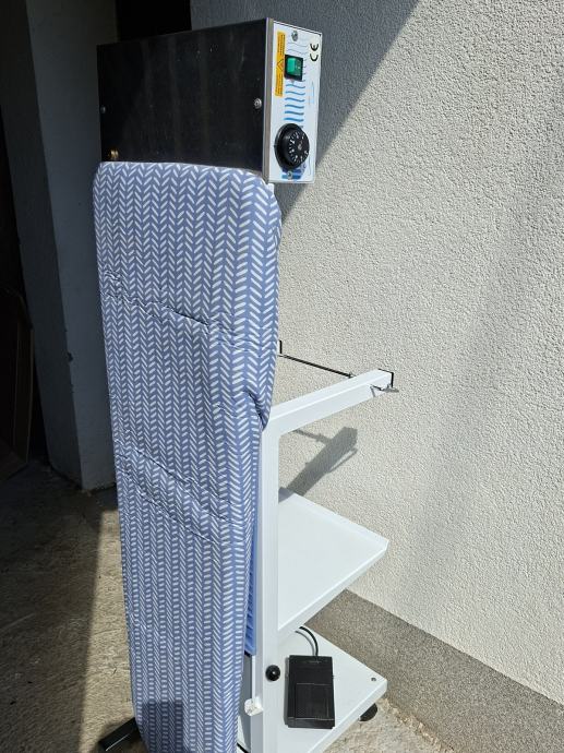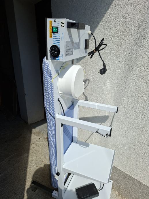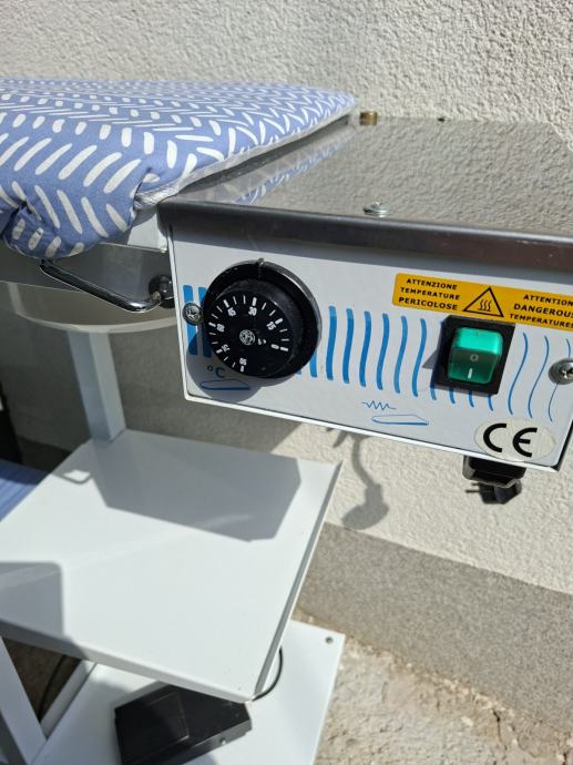 Prodajem rabljeni profesionalni stol za peglanje marke Comel. Stol ima ugrađenu vakuumsku ploču s regulatorom temperature i glavnim prekidačem, a dolazi i s nožnom pedalом za upravljanje. Konstrukcija je metalna s bijelim okvirom, površina za peglanje presvučena je sivom tkaninom s uzorkom. Stol je stabilan, na kotačićima za lakše premještanje, te ima dodatnu policu u donjem dijelu.