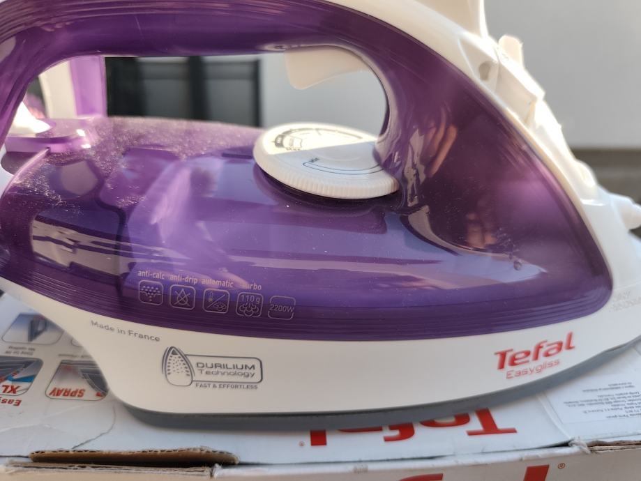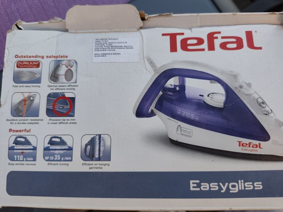 Prodajem novo Tefal parno glačalo model Easygliss snage 2200W. Glačalo je bijelo-ljubičaste boje s Durilium potplatom koja omogućuje lagano klizanje po tkanini. Snaga pare iznosi do 35 g/min, a pri potrebi može isporučiti i do 110 g/min u kratkom naletu. Proizvođač je Francuska.