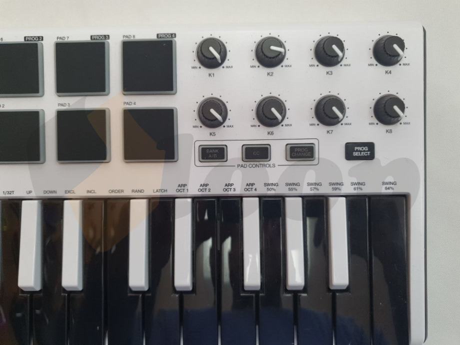 Ako ste glazbenik u pokretu ili producent, Akai MPK mini mkII Vam omogućava preuzimanje kontrole nad stvaranjem glazbe bilo kada i bilo gdje! Dovoljno mali kontroler da stane u ruksak, ovaj premalen USB napajani MIDI kontroler daje Vam 25 mini-tipki osjetljivih na dodir, sekciju za spuštanje i podizanje oktave, ergonomski 4-smjerni thumbstick za pitchbend i mod zaduženja. Također dobivate osam padova sa osvjetljenjem (2 x 4 banke) s MPC Repeat i Full Level, plus osam zaduživih Q-Link kotačića. Kao dodatak nalazi se arpeggiator na kontrolnoj ploči sa zaduživom rezolucijom, rasponom i načinima rada.
