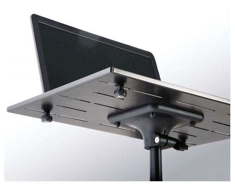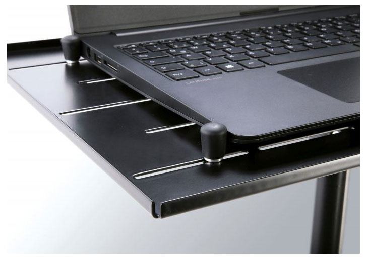 Zahvaljujući podesivim steznim vijcima s gumenim čepovima, prijenosno računalo je zaštićeno i miže se sigurno osigurati na postolju. Da biste pričvrstili prijenosno računalo, pričvrsne vijke pritisnite na prijenosno računalo pomoću krilnih matica. Visina stalka može se podesiti varijabilno. Za transport se ladica može lako ukloniti bez uporabe alata. Robusne tronožac noge brzo se sklapaju u kompaktan i jednostavan paket za nošenje.