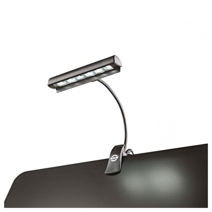 Atraktivna orkestralna svjetiljka s 6 izuzetno svijetlih, energetski učinkovitih LED dioda. Pakiranje uključuje 3 AAA baterije, napajanje i torbicu. Lampica ima prekidač s dvije razine svjetline. Svjetlosni konus je ograničen na glazbeni list pomoću zaštitnog štitnika i može se postaviti u skladu s individualnim potrebama pomoću fleksibilnog guščjeg vrata. Izuzetno snažna kopča osigurava sigurno držanje na notnim stalcima. S magnetnim držačem 12256 može se koristiti kao svjetlo za stajanje.