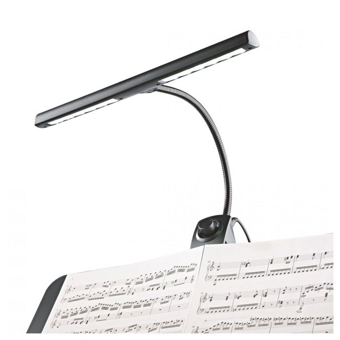 Opremljena s 12 energetski štednih i izdržljivih LED dioda, jamči optimalnu rasvjetu stalka za note. Redizajnirana lampica sada može raditi s baterijama ili s napajanjem. Svjetlina se podešava pomoću promjenjivog prekidača svjetline. Fleksibilni guščji vrat omogućuje da je svjetlo idealno smješteno. Zgodna kvačica omogućuje jednostavno pričvršćivanje na sve notne stalke debljine 25 mm. Uključuje napajanje s 3 m kabelom i 3 AA baterije.