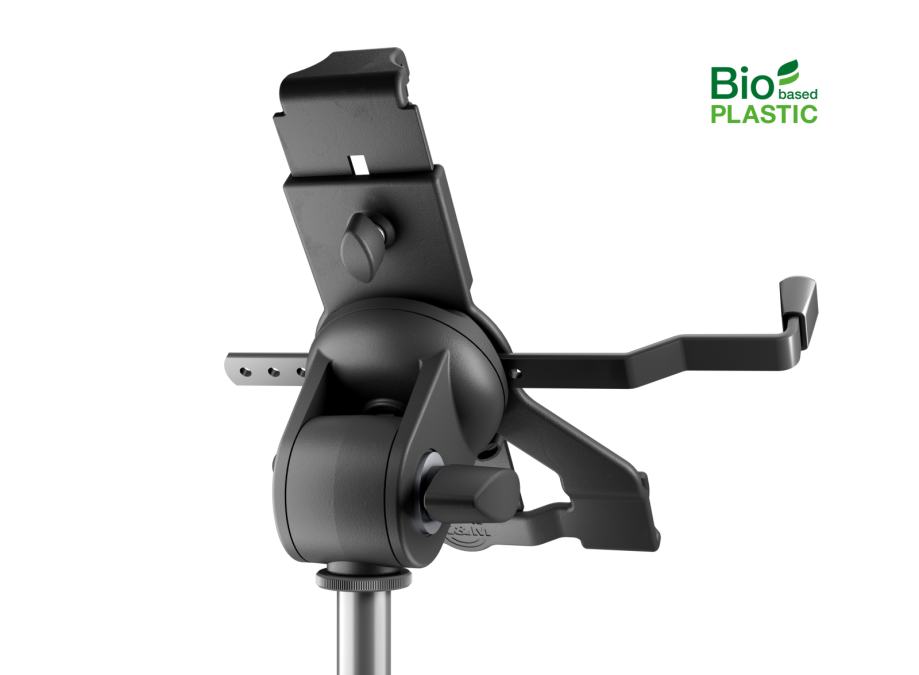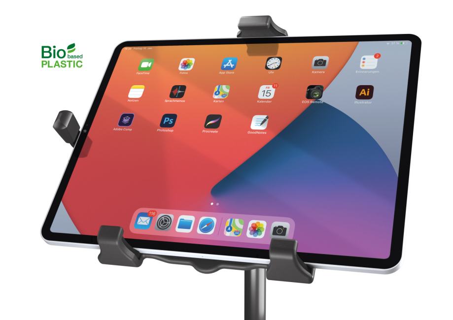 Konig & Meyer Biobased stalak/držač za tablet. Kataloška šifra K&M stalka: 1974400055. Univerzalni držač tableta s praktičnim steznim mehanizmom za sve tablete veličine cca. od 10" do 16". Nosač tableta izrađen je od bioplastike. Ova plastika sadrži udio od preko 50% do 100% obnovljivih biljnih sirovina. Raspon stezanja držača stalka za tablet je između 158 i 280 mm. Držač je također posebno prikladan za tablete sa zaštitnim omotom ili kućištem do 20 mm debljine. Preklapajuće stezne čeljusti s integriranim gumenim jastučićima osiguravaju sigurno držanje i eliminiraju neželjene vibracija. Držač se može naginjati i okretati između portretnog i pejzažnog formata. Bilo na pozornici, u prostoriji za probe ili kod kuće - zahvaljujući 3/8" ili 5/8" unutarnjem navoju, držač se može lako pričvrstiti na bilo koji stalak za mikrofon ili slično.