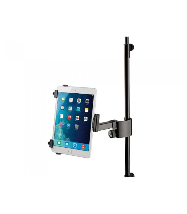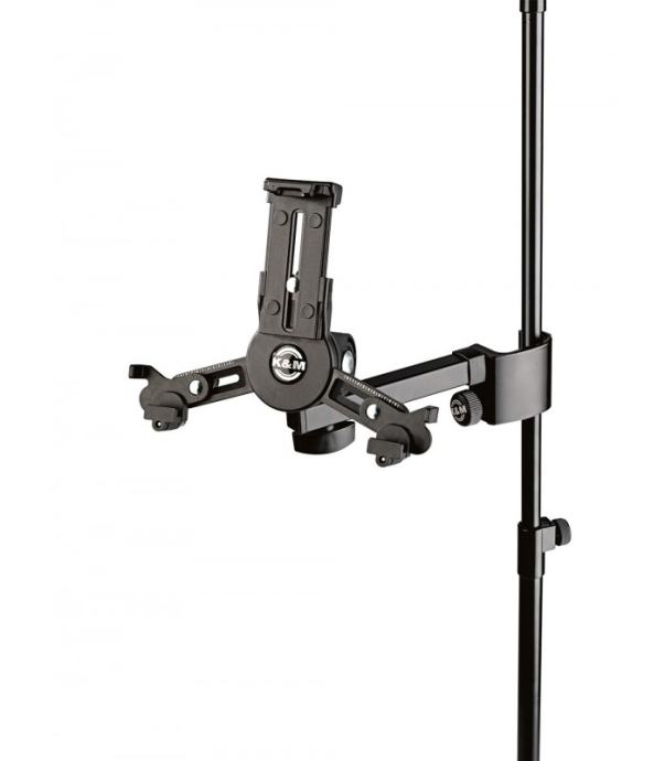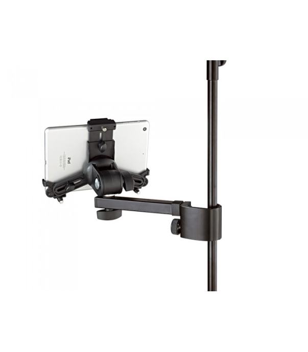 Konig & Meyer Držač/Stalak tableta. Kataloška šifra: 1979600055. Univerzalni držač tableta za različite modele može se varijabilno prilagoditi različitim veličinama tableta bez potrebe za alatima. Bilo na pozornici, u prostorijama za probe ili kod kuće - zahvaljujući snažnom steznom elementu s ergonomskim steznim vijkom, držač se može brzo i jednostavno pričvrstiti na bilo koju cijev do 30 mm. Individualno podesive potporne ruke mogu se prilagoditi upotrebi tableta u rasponu visine od 163 do 242 mm i širine od 102 do 189 mm (kao što su npr. iPad mini, iPad Pro 9.7, Amazon Fire HDX 8.9, Google Nexus 9). Dubina tableta može varirati između 5 i 11 mm. Za druge namjene tablet se može pričvrstiti i odvojiti brzo i jednostavno pomoću kopče. Praktična krilna matica omogućuje podešavanje kuta, tako da će svaki korisnik lako moći pronaći svoj idealan položaj. Tablet se može prebacivati između portretnog i pejzažnog položaja. Tablet ostaje na mjestu, nema opasnosti da tablet samostalno promijeni položaj.