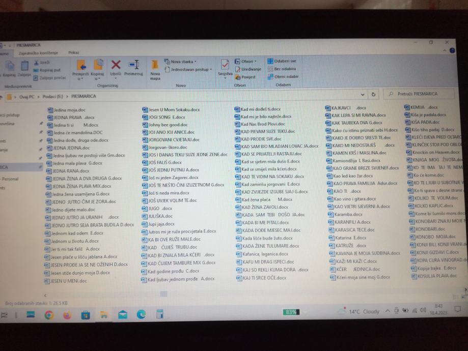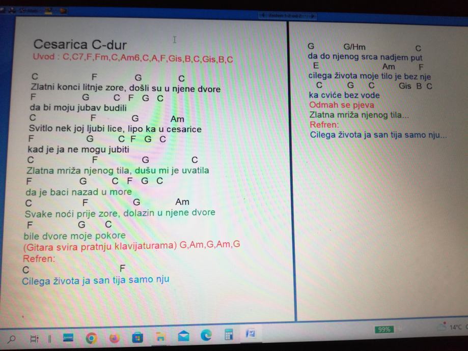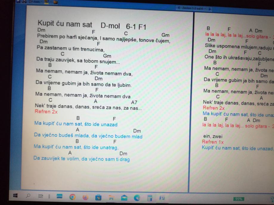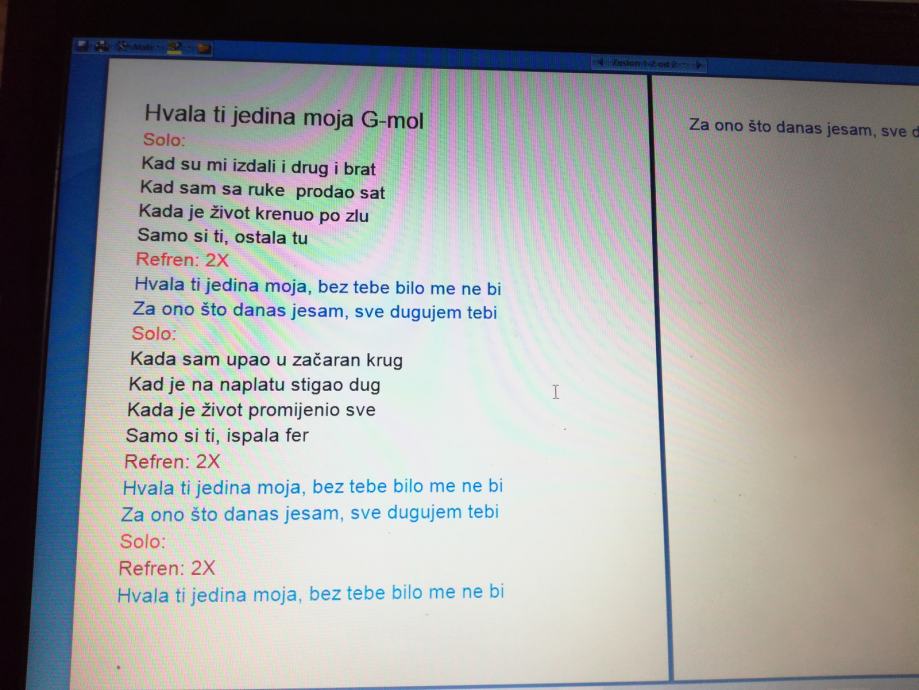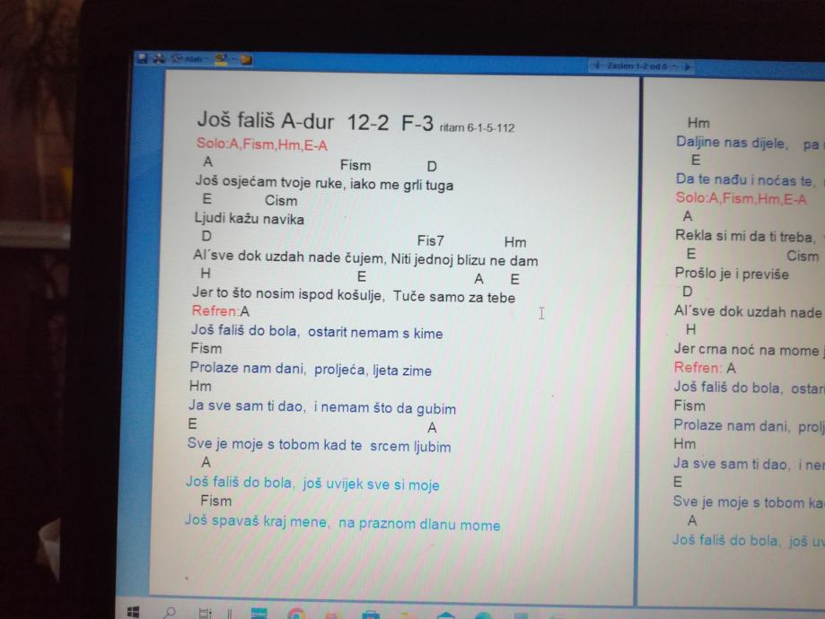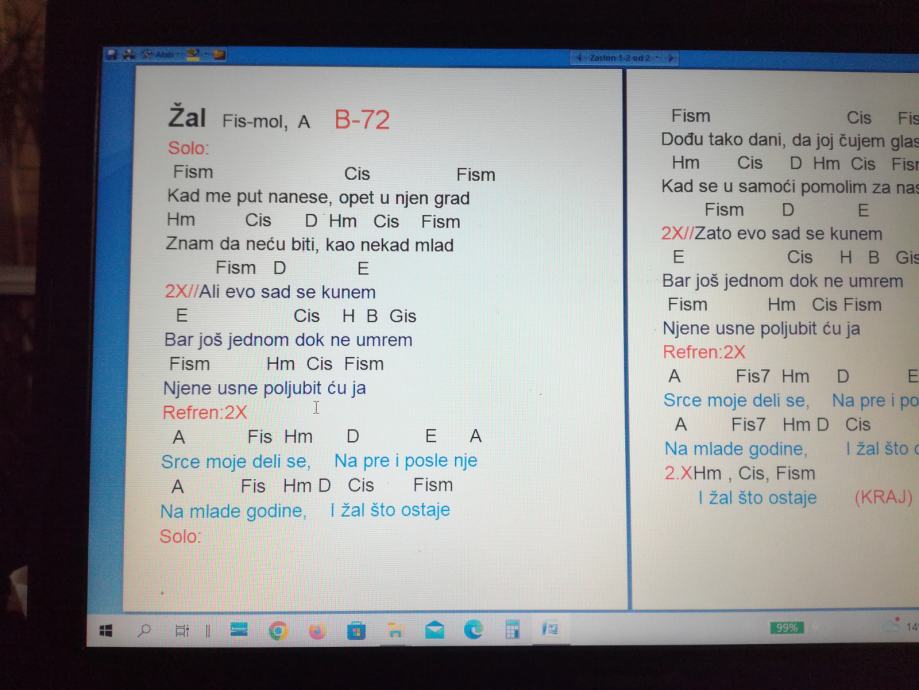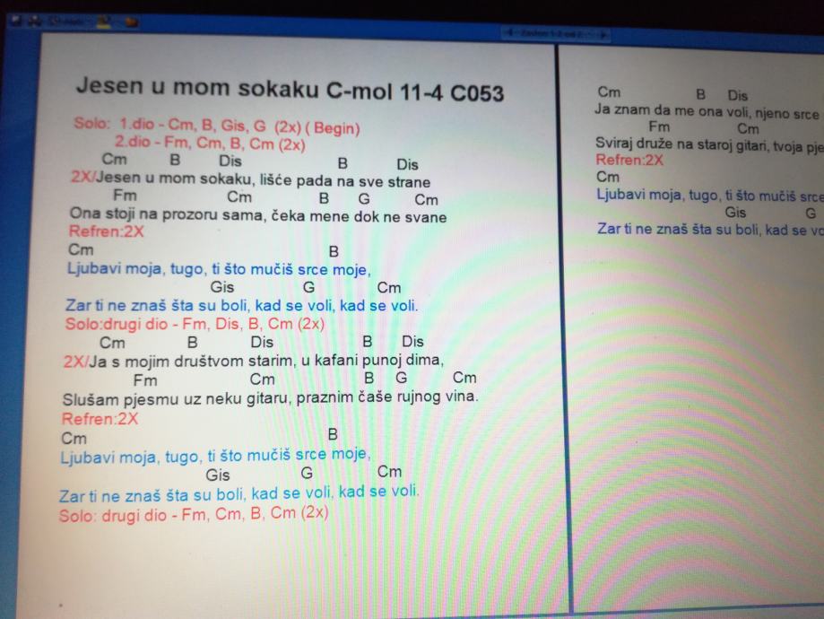 Prodajem pjesmaricu sa preko 1400 pjesama na stiku. Pjesme su pisane istim fontom slova sa različitom bojom kitice i refrena radi lakšeg snalaženja kod pjevanja. Kod zahtjevnijih pjesama upisani su i akordi iznad teksta kao na slici. Sadržaj dajem na sticku.