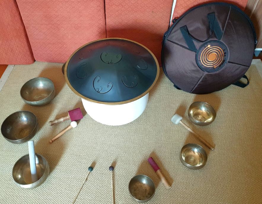 Ispod njega je kristalna zdjela promjera 40,5,a visine 32 cm,napukla,ali zaljepljena,sluzi kao pojacalo i produzava zvuk,ona je u cijeni kompleta
