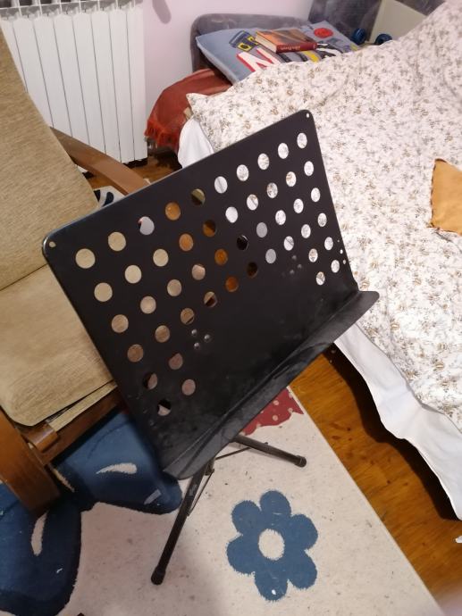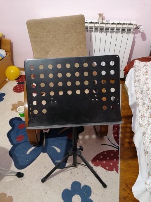 Odličan, čvrst, masivan i pouzdan stalak za note ili tablet ili laptop. Pouzdan čak i kod velikog tereta kao što su 4 debela rokovnika. Stagg notni stalak, vrhunska izrada. Korišten godinama na otvorenom a doista se po ničemu, osim po cijeni, ne razlikuje od novog, tj. nigdje nije ogreban, smotan, nema hrđe, grip gumice na njemu u mint stanju, malobrojni plastični dijelovi također mint. Vlaga, morski, planinski zrak, ni sunce, ništa mu ne smeta. Maksimalna visina 148cm,spustiti se može maksimalno do 55cm,tako da je upotrebljiv svim uzrastima i položaju glazbenika. Na njega se lako montiraju i dodatni stalci, osvjetljenje, razni nosači(za trzalice, slajdove, nosač usne harmonike i ostalo). Robustan, pouzdan, lako sklopiv, a ne zauzima puno prostora, i uličnim glazbenicima neće biti pretežak za nositi u ruci. Stalak koji će Vas doživotno pouzdano služiti, po super povoljnoj cijeni.
