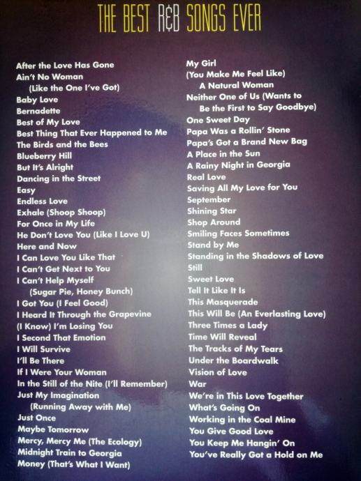 * Papa Was a Rollin' Stone * Saving All My Love for You * Shop Around * Stand By Me * Three Times a Lady * Under the Boardwalk * What's Going On