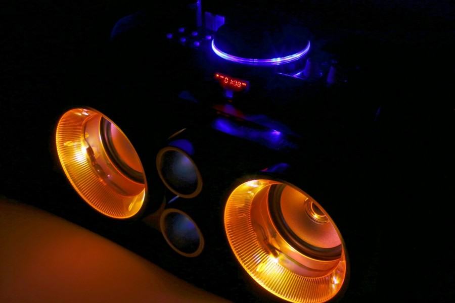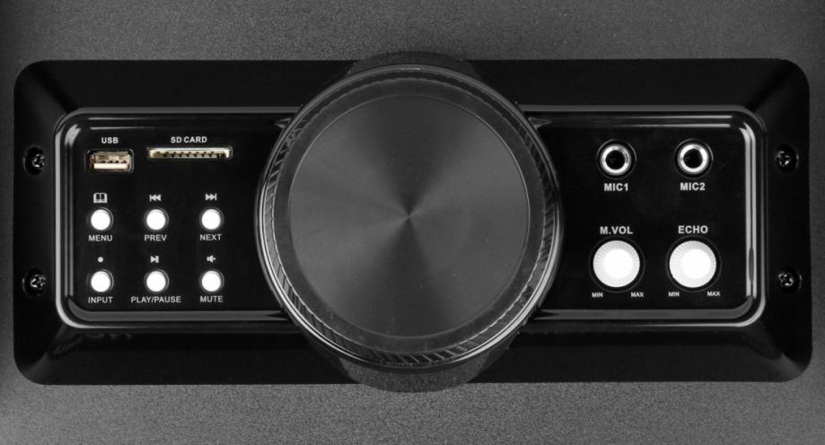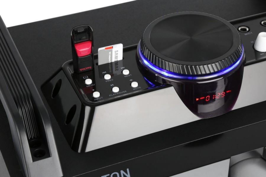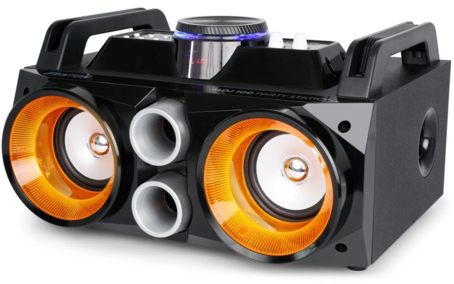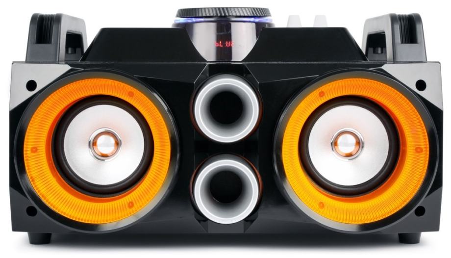 With the MDJ100, creating a party out of nowhere has never been so easy. Simply bring an external hard disk with your music collection and connect it to the USB input on top of the party station. You can also connect your smartphone over BT or use the Aux input on the back. Each speaker has a pair of RGB LED's that will light up the cone of the woofer and add a spectacular light-show. The built-in battery gives you ultimate flexibility in where to place your party station and host your party.