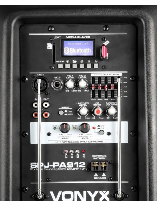 Aktivni zvučnik, s vlastitim akumulatorom, idealan kao mini prijenosni razglas. Dolazi s daljinskim upravljačem i bežičnim mikrofonom.