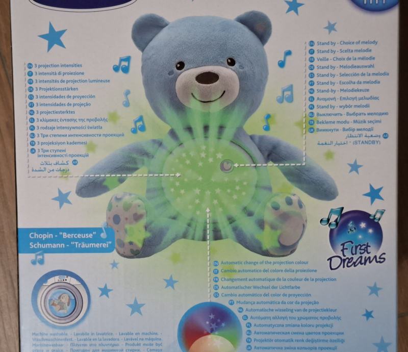 Igračka s projektorom i glazbom Chicco Baby Bear First Dreams Neutral 0 m+ opušta bebu svojom mekanom površinom. Ima svjetlosne efekte koji automatski mijenjaju boju i reproduciraju različite vrste glazbe (klasičnu, jazz, zvukove prirode, lagani rock, new age i suvremenu glazbu). Svjetlo se može koristiti u obliku projekcije noćnog neba, ali i kao noćna lampica. Intenzitet svjetlosti se može podesiti. 3 vrste postavki svjetlosnih efekata: zidni projektor, nježni projektor, noćno svjetlo. Elektronički dio može se izvaditi, tako da možete oprati medu u perilici rublja.