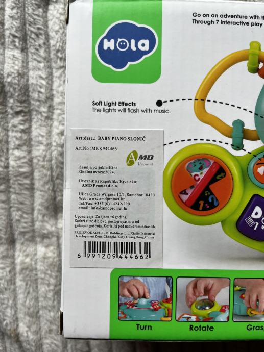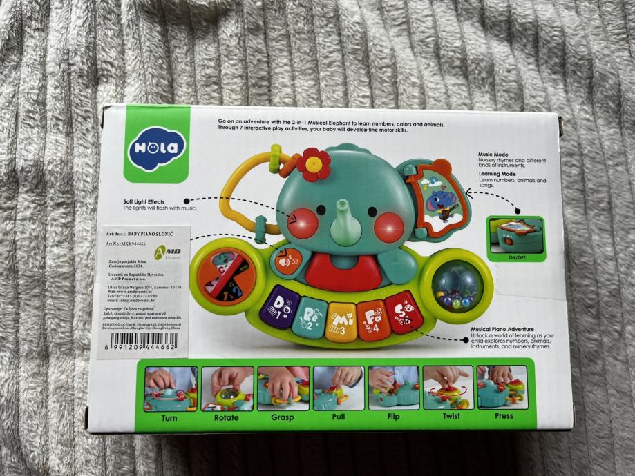 Glazbeni klavir je igračka za djecu od 6 mjeseci starosti. Izrađena od najkvalitetnije plastike, izuzetno šarena, dugo će privlačiti pažnju svakog djeteta. Glazba pozitivno utječe na razvoj i dobrobit djeteta. Sviranje na instrumentima omogućit će djetetu da oblikuje svoju osobnost i karakter, razvije osjećaj za ritam i strast prema glazbi. Igračka se napaja AAA baterijama (3 X 1,5V), baterije nisu uključene.