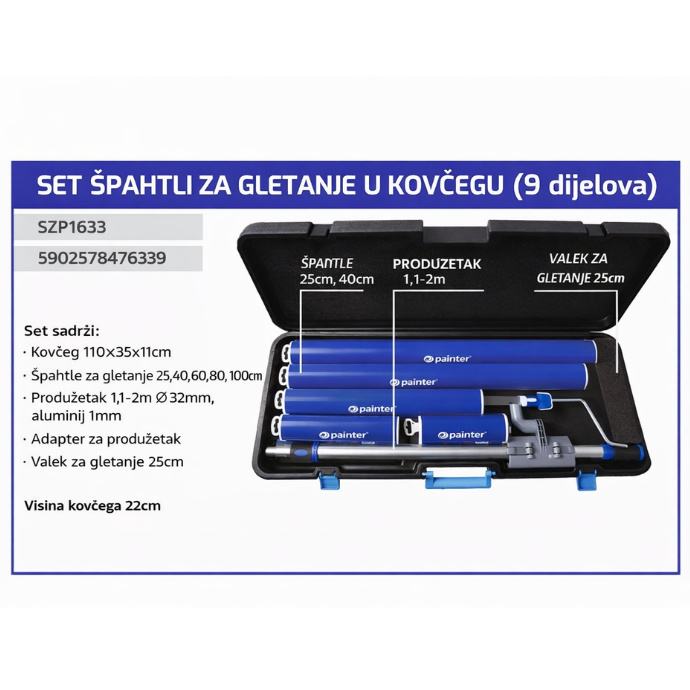 Profesionalni PAINTER set špahtli za gletanje osmišljen je za savršenu završnu obradu zidova i stropova. Idealan izbor za majstore i zahtjevne kućne korisnike koji traže kvalitetu, preciznost i praktičnost u jednom setu.