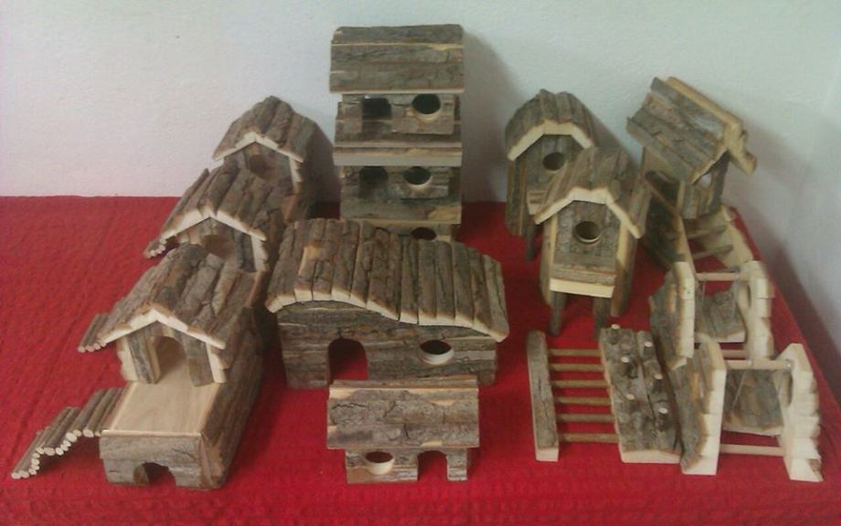 Kod nas također možete nabaviti domaće planinsko sijeno s naših livada u Gorskom kotaru, mješavinu sušenog ljekovitog bilja (sastoji se od čak 25 vrsta rukom branih ljekovitih i začinskih biljaka koje su ukusna i zdrava dopuna prehrani vašeg ljubimca), te ručno rađene drvene kućice (male brvnarice ili veći model, od obrađene daske - zadnja slika), penjalice i veće deblje grane za uređenje nastambe i trošenje zubića.