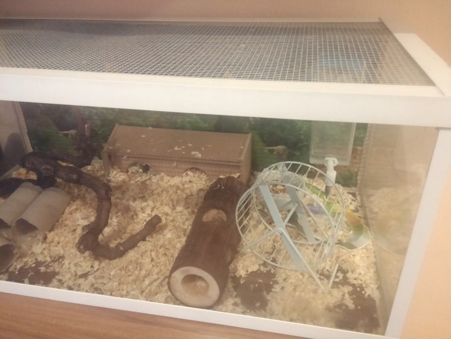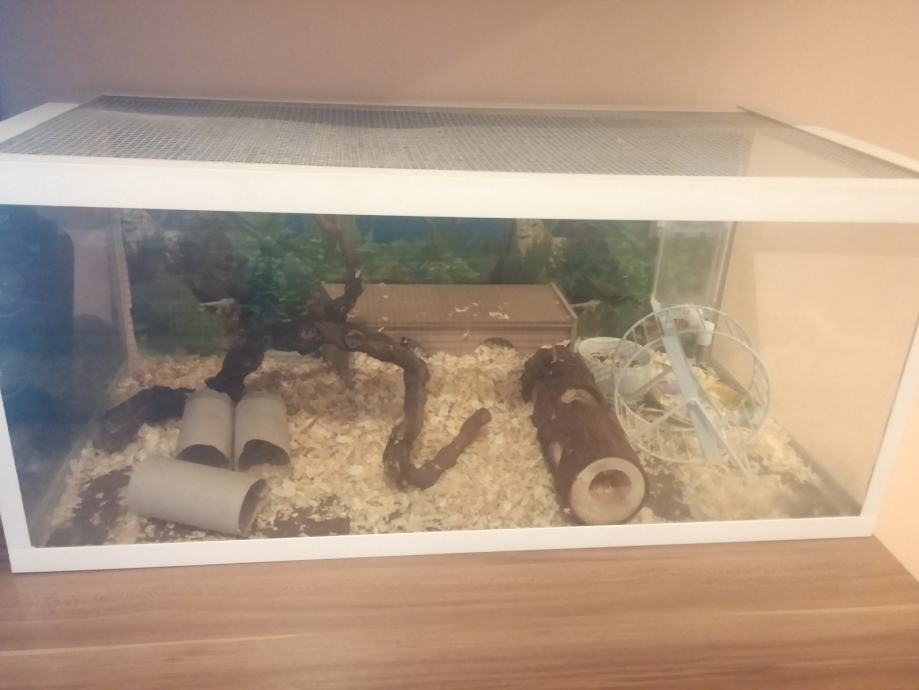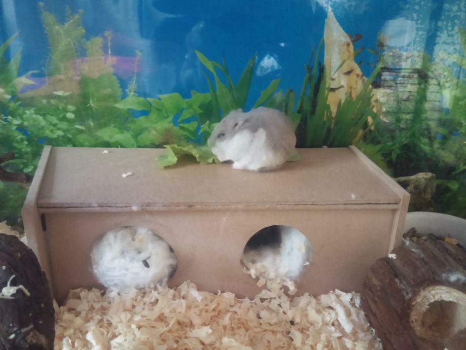 Prodajem par kineskih hrcki star god dana sa jednim mladim, u cijenu je ukljucena i kompletna oprema sa hranilicom, pojilicom, kucicom, vrtuljkom raznim granama, dajem i nesto hrane i piljevinu... sve to je smjesteno u terariju 70x30x30 sa poklopcem...