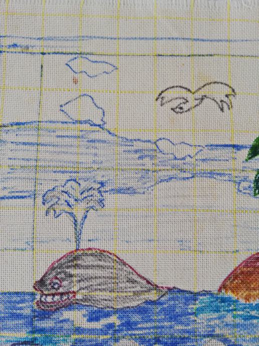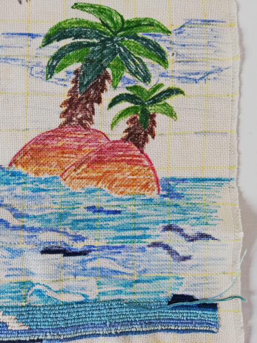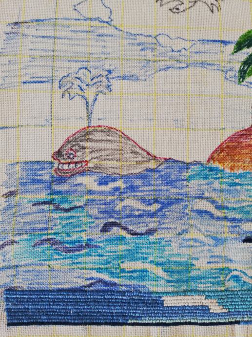 Crtež nacrtan na goblenskom platnu - UNIKAT - palme - otok - kit