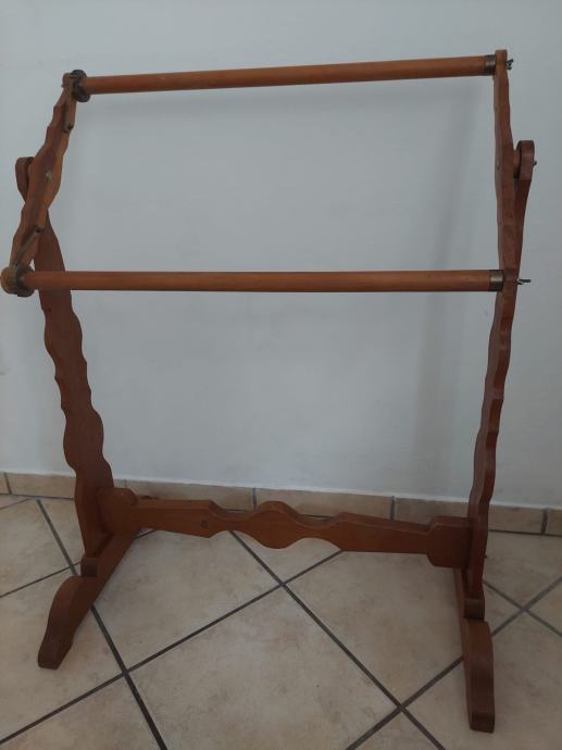 Drveni samostojeći stalak za izradu goblena. Ručno izrađen stalak od hrastovog drveta i mesinga. 130 eura.