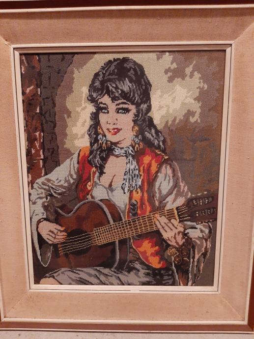 Goblen - Ciganka sa gitarom, veličina bez okvira cca 43x50 cm, uokvireno.