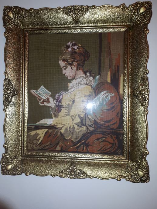 Goblen, Čitateljica, barokni okvir. Veličina 56x68 cm (s okvirom). Ustakljeno, u savršenom stanju. Dugo Selo (ZG) ili besplatna dostava u Zagreb, Trešnjevka, po dogovoru.
