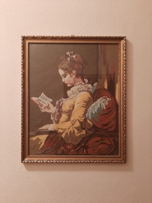 Goblen Djevojka koja čita, dimenzije sa okvirom 56 x 46 cm, pozlaćeni okvir.