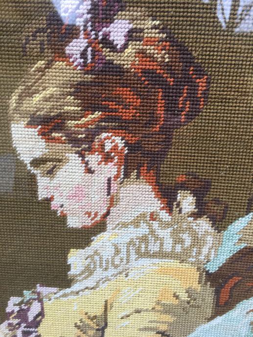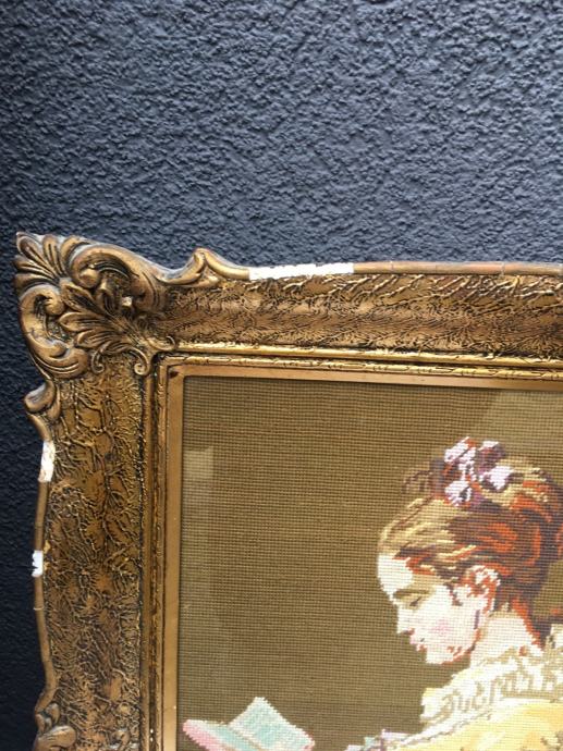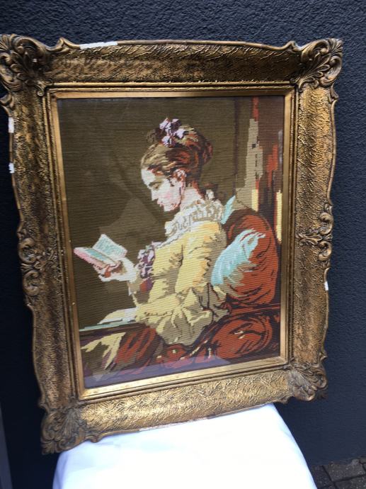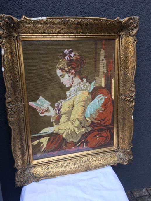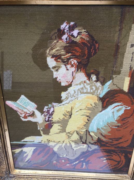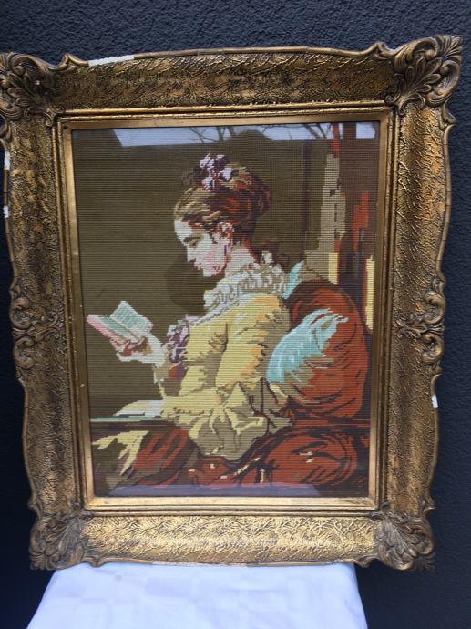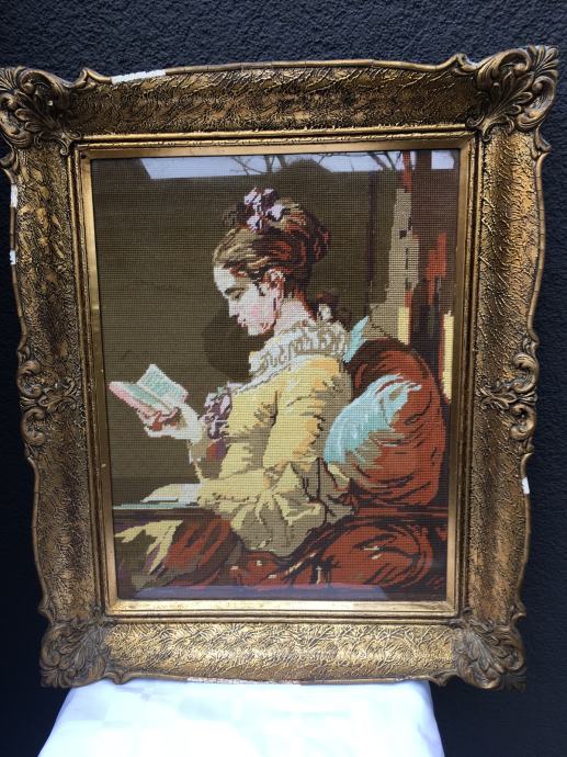 Goblen Djevojka koja čita, ručni vez, uokviren, wilerovo originalno platno, shema i konac.