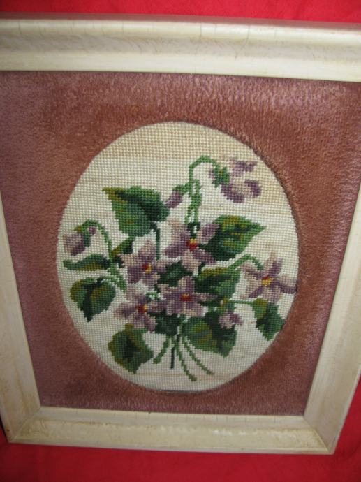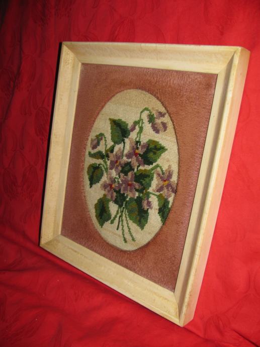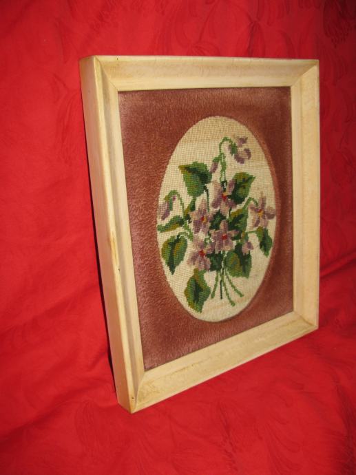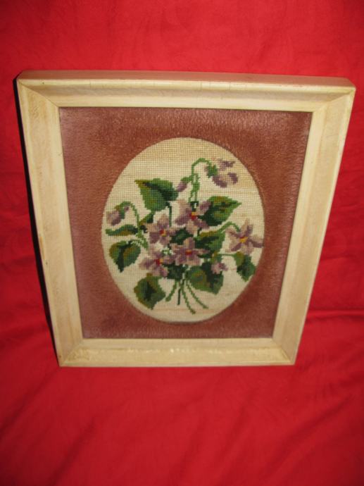 Goblen LJUBIČICE. Drveni okvir sa paspartuom. 23 x 27 cm. SAND
