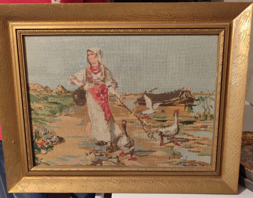 Ovaj goblen prikazuje motiv "Guščarica na Savi", popularan klasični goblen proizveden u bivšoj tvornici konca Unitas u Zagrebu.