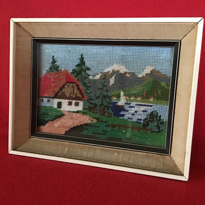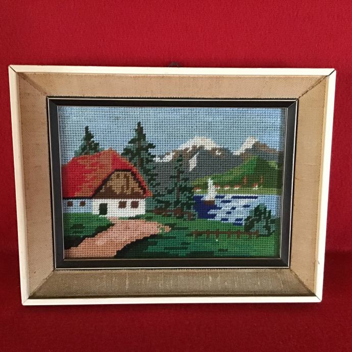Goblen planinska kuća uz jezero je kvalitetni ručni vez, originalno platno, shema i konac.