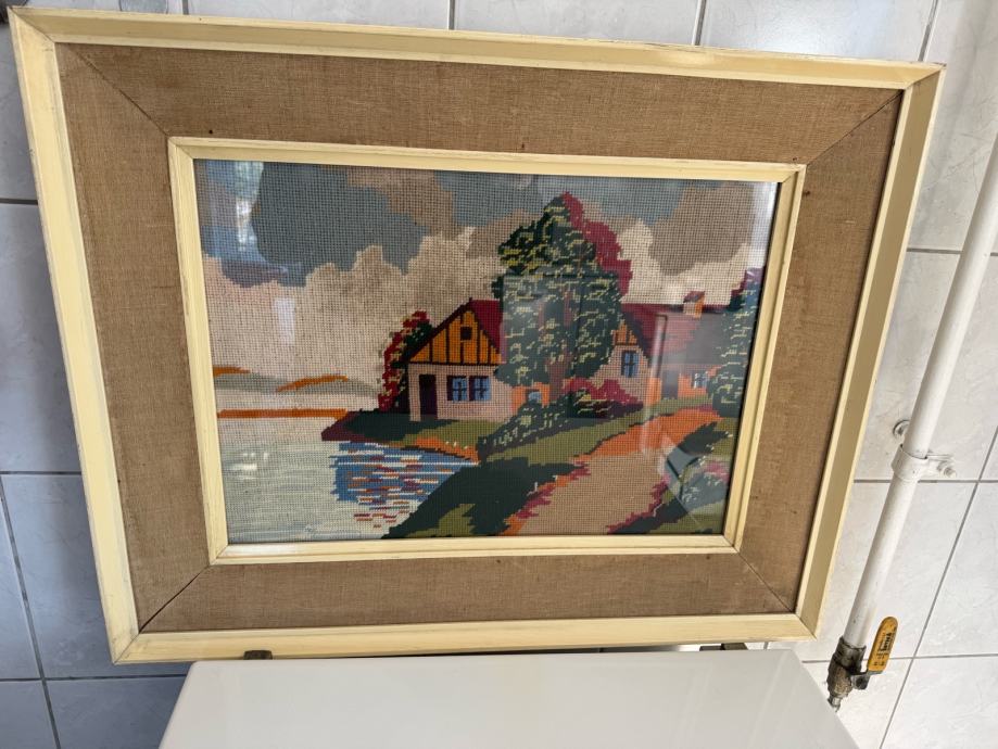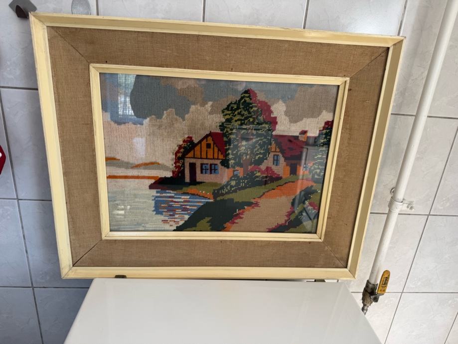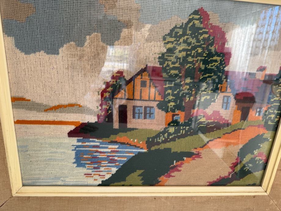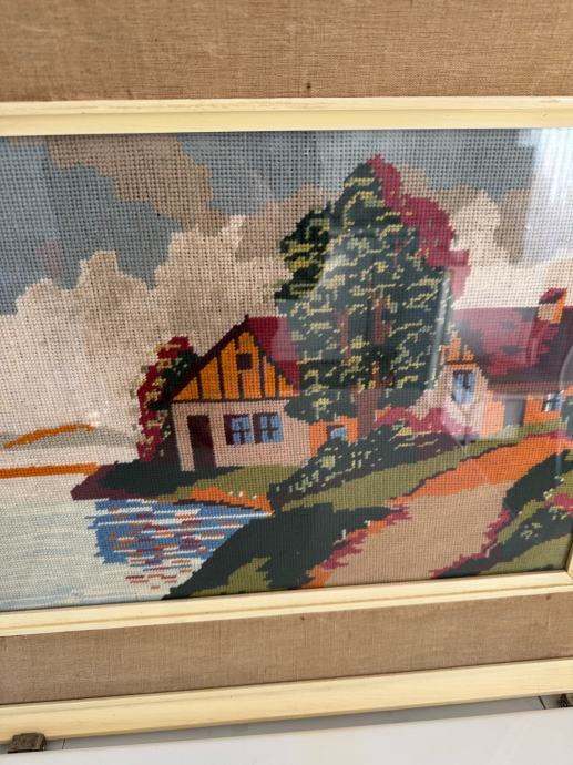 Prodajem prekrasan ručno rađeni goblen s motivom kućice uz vodu. Slika je u platnenom okviru i pod staklom.