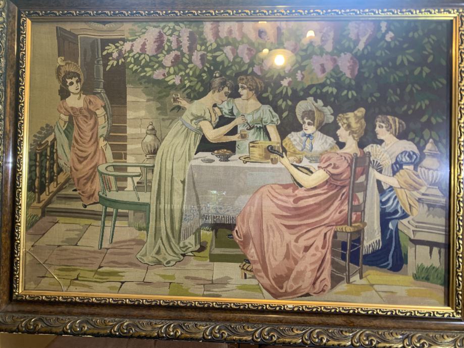 Prodajem ručno izrađen goblen u dobrom stanju, dimenzija 120*80 cm, star između 50 i 100 godina, spada u kategoriju vintage, vezen izuzetno finom gustoćom (24 boda po inču), kombinacija vune i svile. Prikazuje elegantnu vrtno-društvenu scenu u regency stilu. Okvir je originalan, drveni, bogato ukrašen. Idealno za kolekcionare, interijere s ankvitetima ili kao vrijedna dekoracija. Kontakt 098/218-675