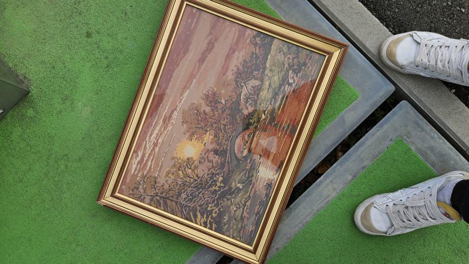 "Na prodaju prekrasan goblen 'Suton' dimenzija 59x44 cm s elegantnim zlatnim drvenim okvirom. Motiv prikazuje miran krajolik u sumrak s domišljatom igrom boja i finim detaljima, idealan za ukras doma, vikendice ili poklon. Goblen je ručni rad u izvrsnom stanju, bez tragova korištenja ili oštećenja. Okvir Mogućnost osobnog preuzimanja ili slanja poštom. Za dodatne informacije i slike slobodno se javite."