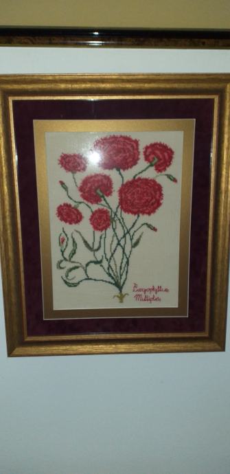 Uramljeni goblen motiv "Ruže". Goblen je uramljen drvenim okvirom i dvije boje paspatua koje goblenu daju profinjen , lijep i bogat izgled.Raden je bodom križića,pedantno,uredno po posebnoj šemi,rijedak primjerak iz kućne kolekcije.Očuvan i bez oštećenja, raden precizno i pedantno bez grešaka.Poštarina uračunata u cijenu.Veličina goblena je60×50 cm.