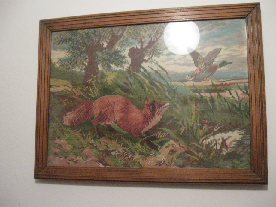 2. Lisica u lovu na divlje patke ( Fuchs auf der Entenjagd 51x36 ), izrađena, drveni okvir i staklo, cijena 60 eura