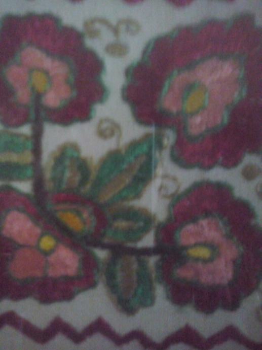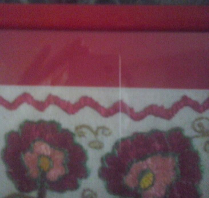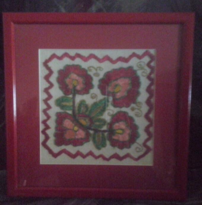 Izvezeni ručni rad, uramljen i ustakljen. Dimenzije 26x26 cm. Izvrsno očuvan. Okvir i parspatu crvene boje.