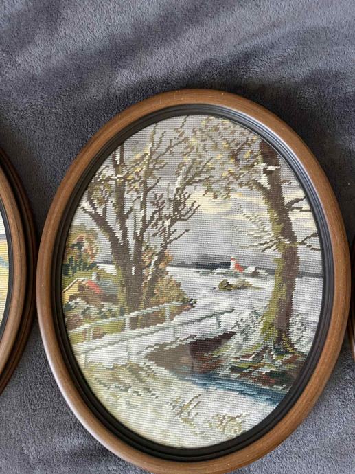Prodajem navede goblene u odličnom stanju, jedan okvir ima oštećenje prdi dnu...ali nije toliko zamjetno. Na dodatna pitanja ne znam koliko mogu odgovoriti jer ne znam puno o goblenima, pronađeno i gledam prodati.