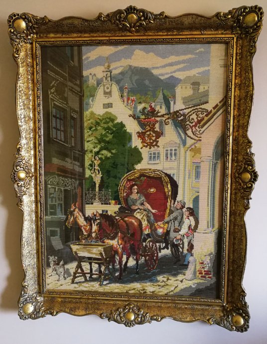 Znači goblen iz naslova u odličnom stanju sa sačuvanom ramom dimenzija goblena cca 53x83 centimetara.