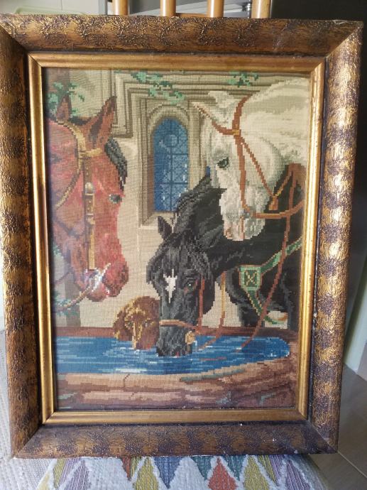 Zbog preseljenja u manji stan, prodajem ručno rađeni Vilerov goblen-konji na pojilu, veličina 35x45, u starinskom drvenom okviru.