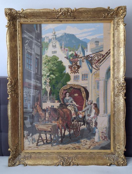 Orig. Wiehler giblen Svadbena kočija, vezen u tehnici tipoen, dim 75 x 99 cm sa okvirom