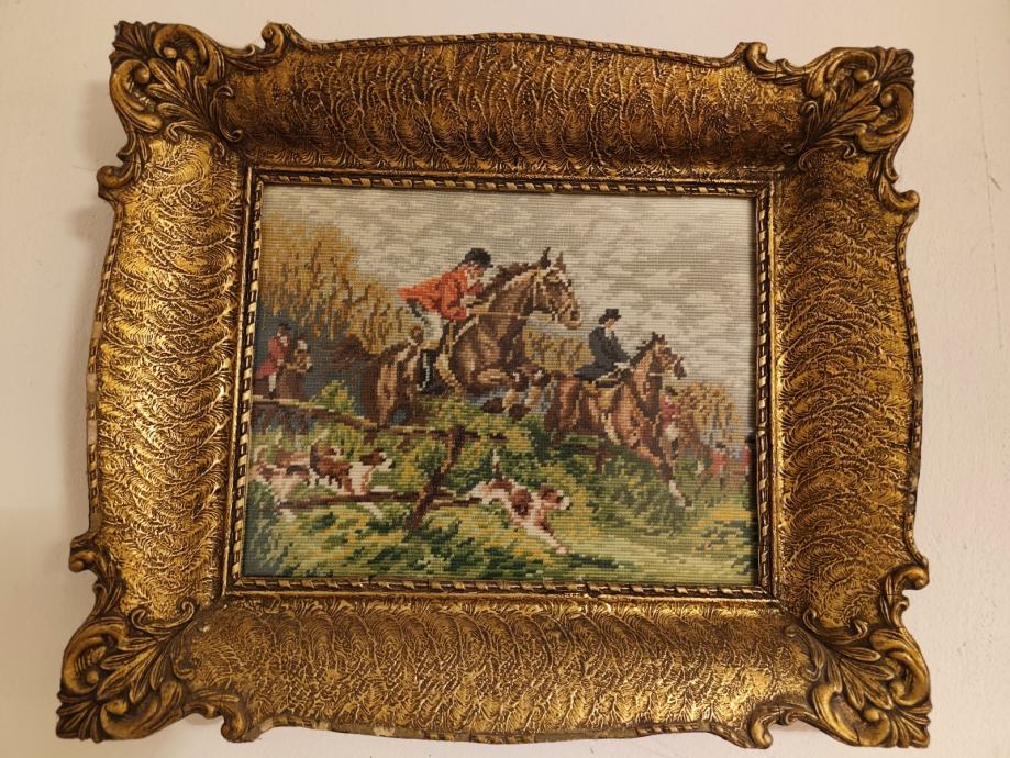 Prodajem Wiehlerov goblen "Lovci na lisice" ( 35x27 cm) uramljen u baroknu ramu (50x43 cm) nigdje oštećen, u izvrsnom stanju.