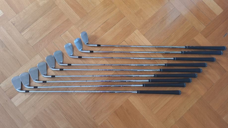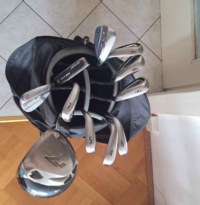 Titleist set željeza za golf s palicama 4–9, sand wedge (P), gap wedge (52°) i lob wedge (60°). Željeza su 1,5 cm duža od standardnih. Odyssey Metal-X putter i Taylormade driver.